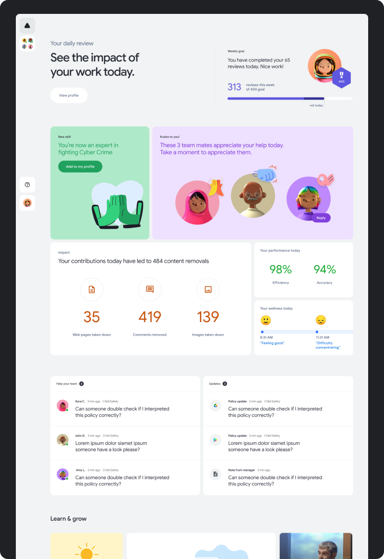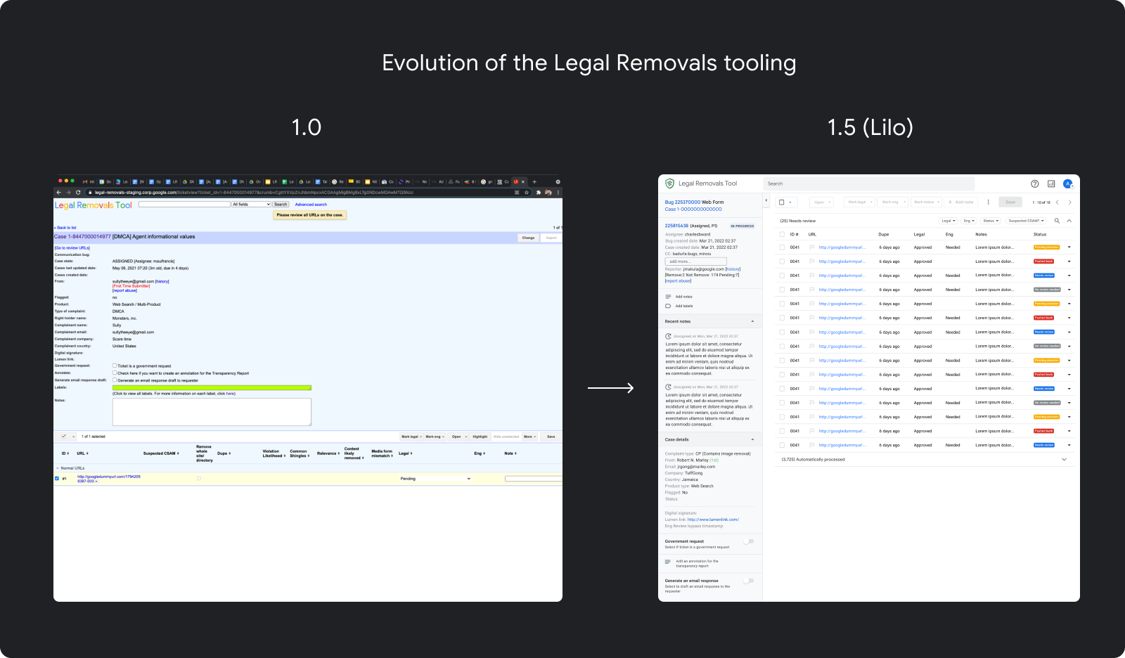 I joined Google in 2021, and landed on the Content Enforcement Legal Removals Engineering (CELRE) team. They build the tools that help Google products, like Search and others, stay safe and legal by being the tool for agents to remove content when needed. My job was to take an 11yr old engineering led product, which processed ~500 million URLs in 2021, and envision what the future experience would be based on the unsatisfactory CSAT responses we were getting year over year, high agent attrition rate due to agent wellness and burnout, and the lack of trust in the product from customers. Within 2 months, I had stakeholder buy-in for the new direction (Moana 2.0) based on feedback, a roadmap which included an immediate low-cost enhancement (Lilo 1.5), and by mid 2022 launched a chrome extension version that reduced overall turnaround time in LRT to first legal decision by ~59%, or 48 hours.