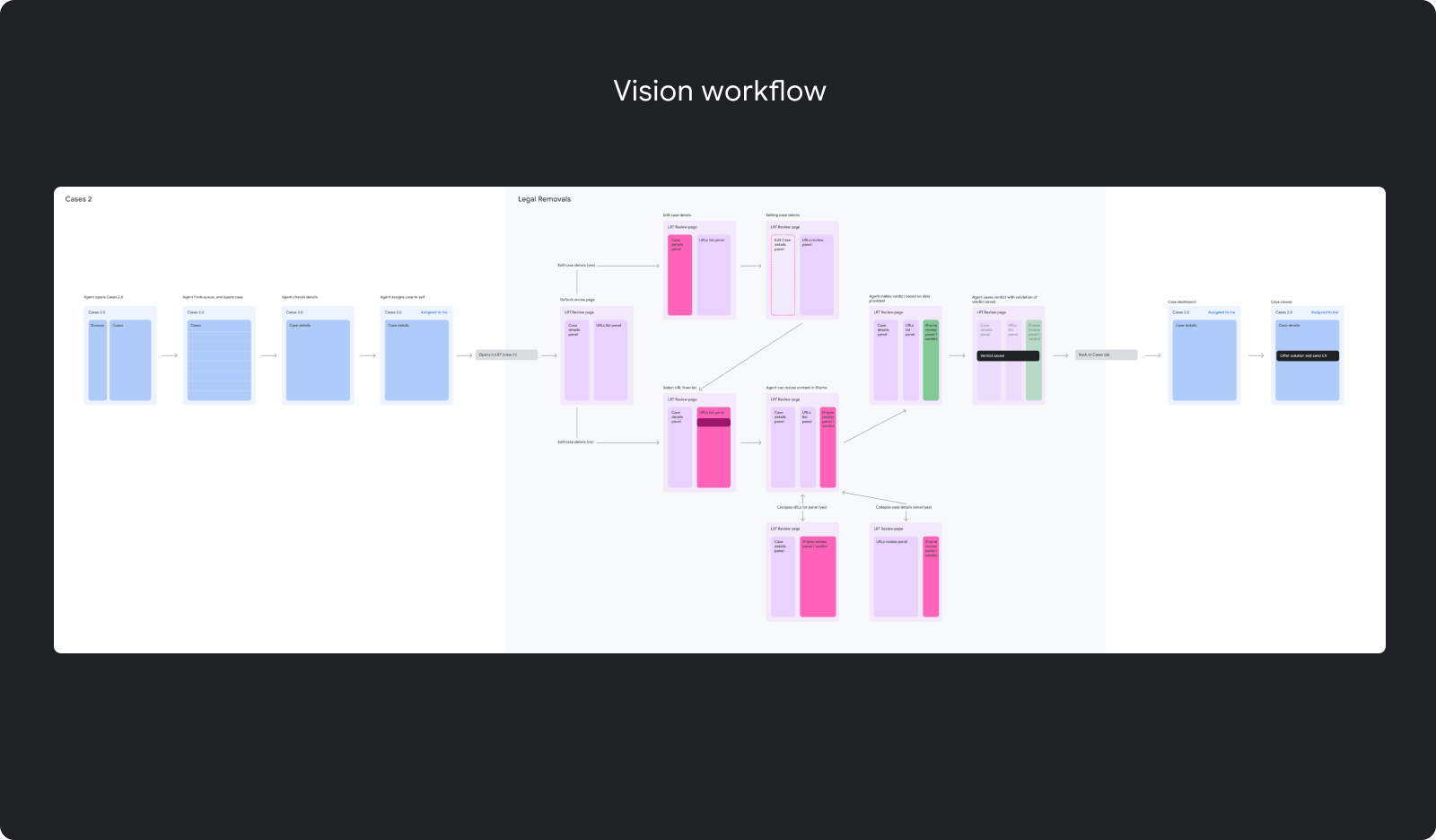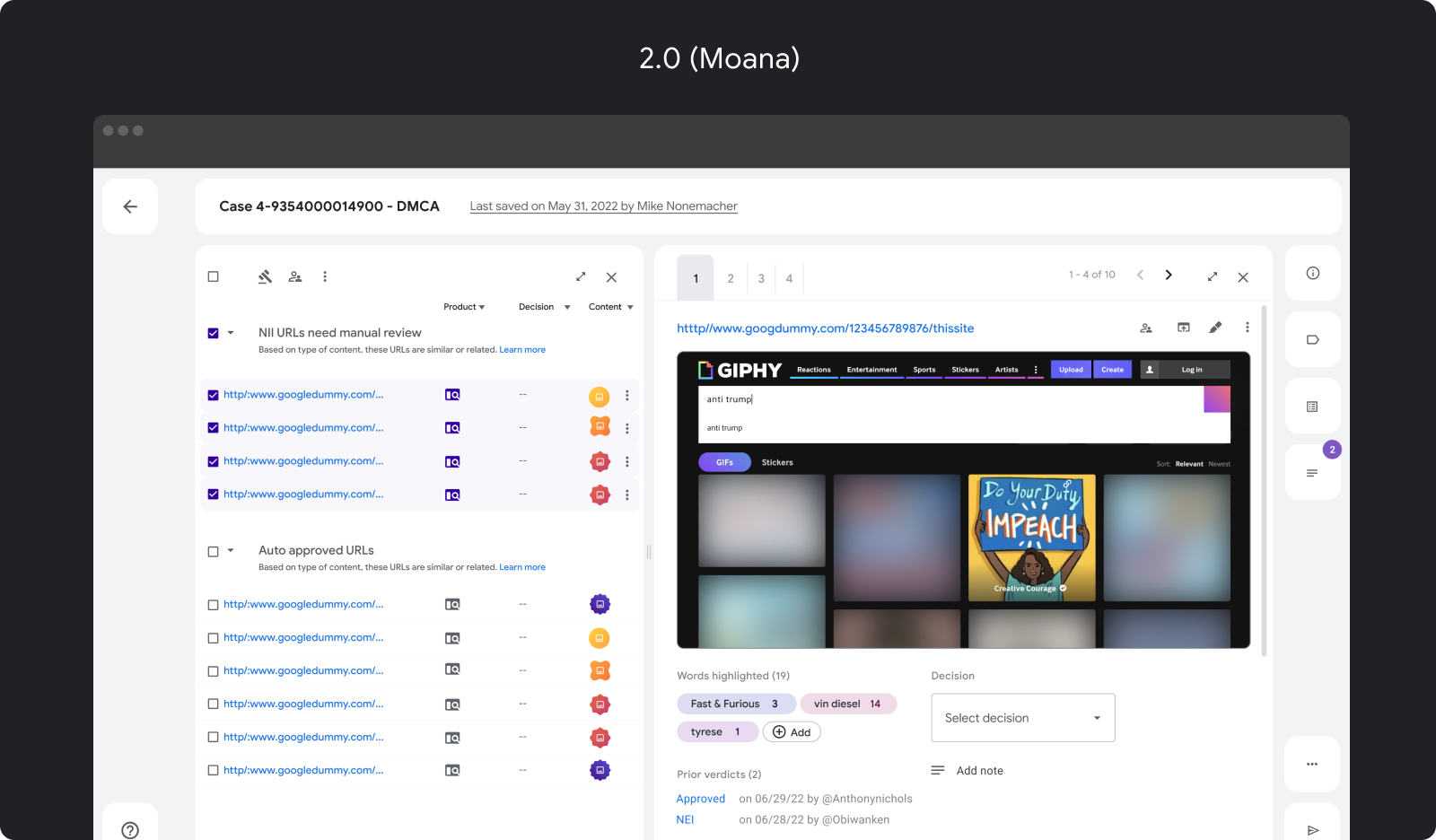 Within two months, I secured stakeholder buy-in for Moana 2.0 based on user feedback. Following our research-driven roadmap, we launched the low-cost Legal Removals tool (Lilo 1.5) in about six months with minimal workflow and front-end updates. The tool had lacked UX input for 11 years. By mid-2022, we launched a Chrome extension that cut LRT’s legal decision time by ~59% (48 hours). I also co-created Google’s content moderation design language, “Prisma,” improving UX for ~13 product areas through unification agent experiences and prioritizing agent wellness.